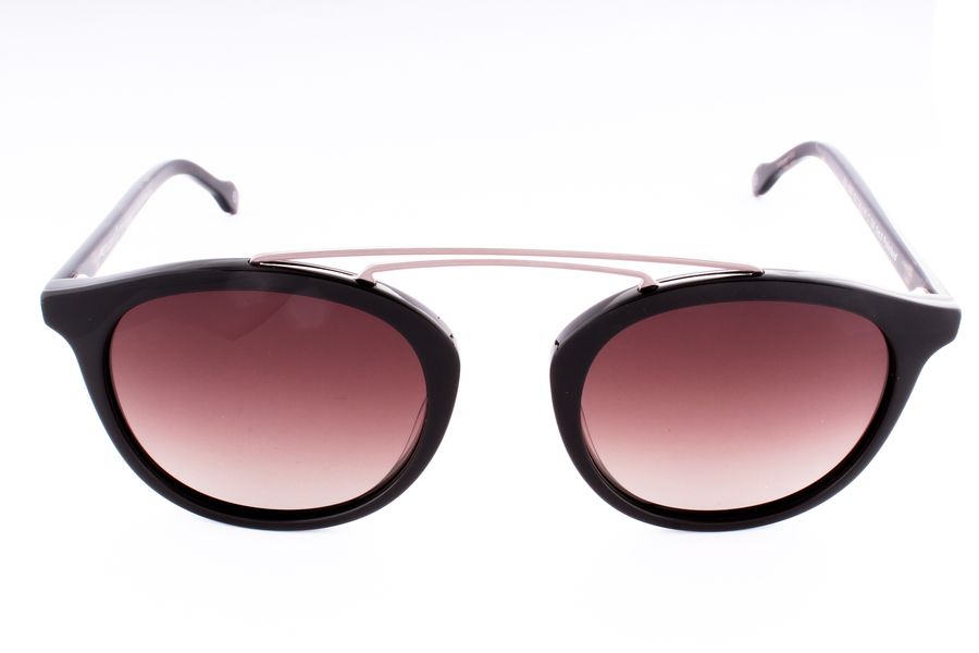 Женские солнцезащитные очки округлой формы с уголками и двойным мостом . Оправа комбинированная : фронтальная часть выполнена из глянцевого пластика тёмно-коричневого цвета, заушники — с включениями бежевого цвета, а переносье и верхний мост — из золотистого металла. Коричневая градиентная линза с поляризационным покрытием обеспечивает наибольший комфорт за рулём, отсекая блики от горизонтальных поверхностей: воды и мокрого асфальта.
